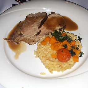 Zwischen den beiden Showblöcken ließen sich die anwesenden Gratulanten die Hauptspeise schme-cken: Die Gäste genossen entweder eine zarte, rosa Kalbsrückenschnitte, Kürbisrisotto mit Madeira-sauce, gebratener Rispentomate und frittierter Peter-silie oder die vegane Alternative eines gegrillten Mushroom-Laibchens, ebenfalls auf Kürbisreis mit Sauce und Beilagen.