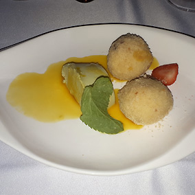 Den süßen Abschluss der Gala bildete das Dessert: Zwei warme Nougatknödeln, kombiniert mit feinem Matcha-Parfait auf Maracuja-Fruchtspiegel oder in der veganen Variante, einem Pistazieneis.